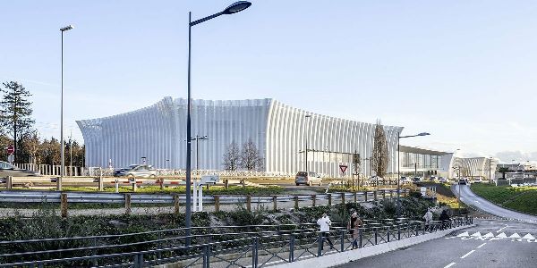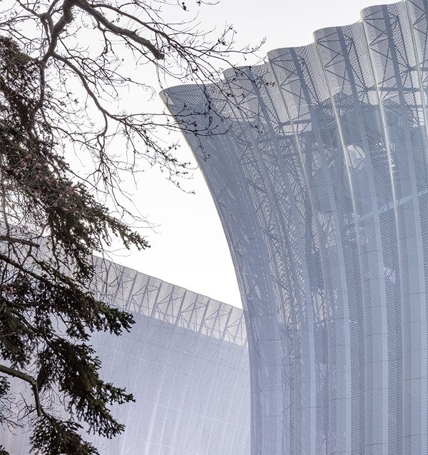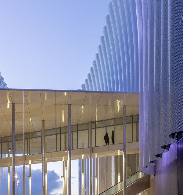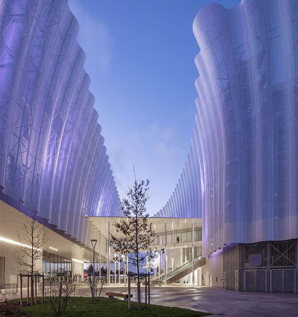 建筑師Ferrier Marchetti Studio設(shè)計的CO'Met Arena擴大了其起伏的表皮結(jié)構(gòu),使結(jié)構(gòu)更加輕盈和流暢。作為大型功能體量的對立面,外墻塑造了一個流動和柔軟的建筑,并延伸到所有的設(shè)施,覆蓋了會議、展覽和體育中心的外表面。金屬板形成了統(tǒng)一的圖案,并以曲線的變化作為點綴,使微妙的光線通過穿孔的平面進入。輕質(zhì)的半透明表皮采用了天空和周圍輪廓和風(fēng)景的顏色。建筑物的入口是通過一個連接設(shè)施體量的大型露天雨棚實現(xiàn)的。該項目是一個雄心勃勃的可持續(xù)發(fā)展方法的一部分,因為它擁有法國最高效的體育項目的能源消耗。體積完全由地?zé)崮茉刺幚恚ㄖ@示出極大的節(jié)儉,重點是輕質(zhì)外墻的設(shè)計,避免使用過多的材料。