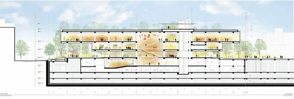 建筑物上層的逃生樓梯通道暴露在外,但嵌套在立面上,可通過外部走道進入,為建筑物的外觀增加了另一層深度。混凝土柱系統用鋼交叉支撐加固,以抵御該地區的地震活動。在地面上,典型的方形混凝土柱子變成了圓形,這些圓形的柱子和圓柱形的機械漏斗一起,填充了地面層。由于沒有不透明的墻壁,這在公園和大海之間創造了意想不到的景觀。