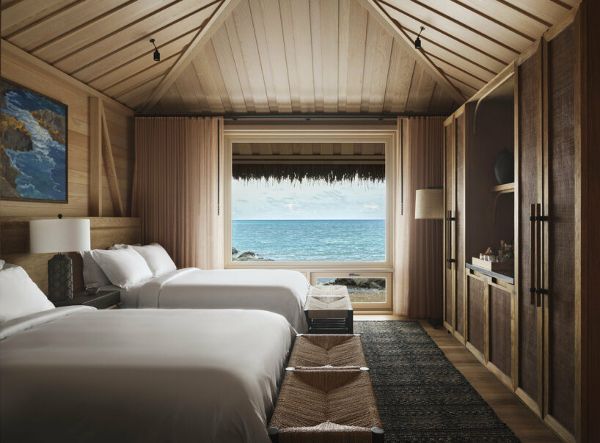 沃克華納的建筑方案謹慎地隱藏在島上的樹線上,既突出了大島多樣化的地理環境和生物環境,又與之相協調。建筑物的定位考慮到了信風,強調了海濱生活的終極奢侈品之一。它們的建造和裝備也使用了天然和負責任的材料,不會耗盡島上的資源。值得注意的是,度假村周圍的茅草屋頂由回收材料組成,而不是島民使用的本地樹葉。其他沃克-華納的選擇加強了這個地方的有機、自然的感覺,包括外墻板的靈感來自于椰子樹干的顏色和暴露的木頭框架。所有這些努力的結果是一個既醒目又低影響的外觀和感覺。
