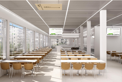主要功能為餐廳,同時配備小賣部和獨立檔口,可供150人左右共同就餐。衛生間重新改造,原打印室位置改為連廊空間。餐廳后廚和就餐區面積約550平方米。