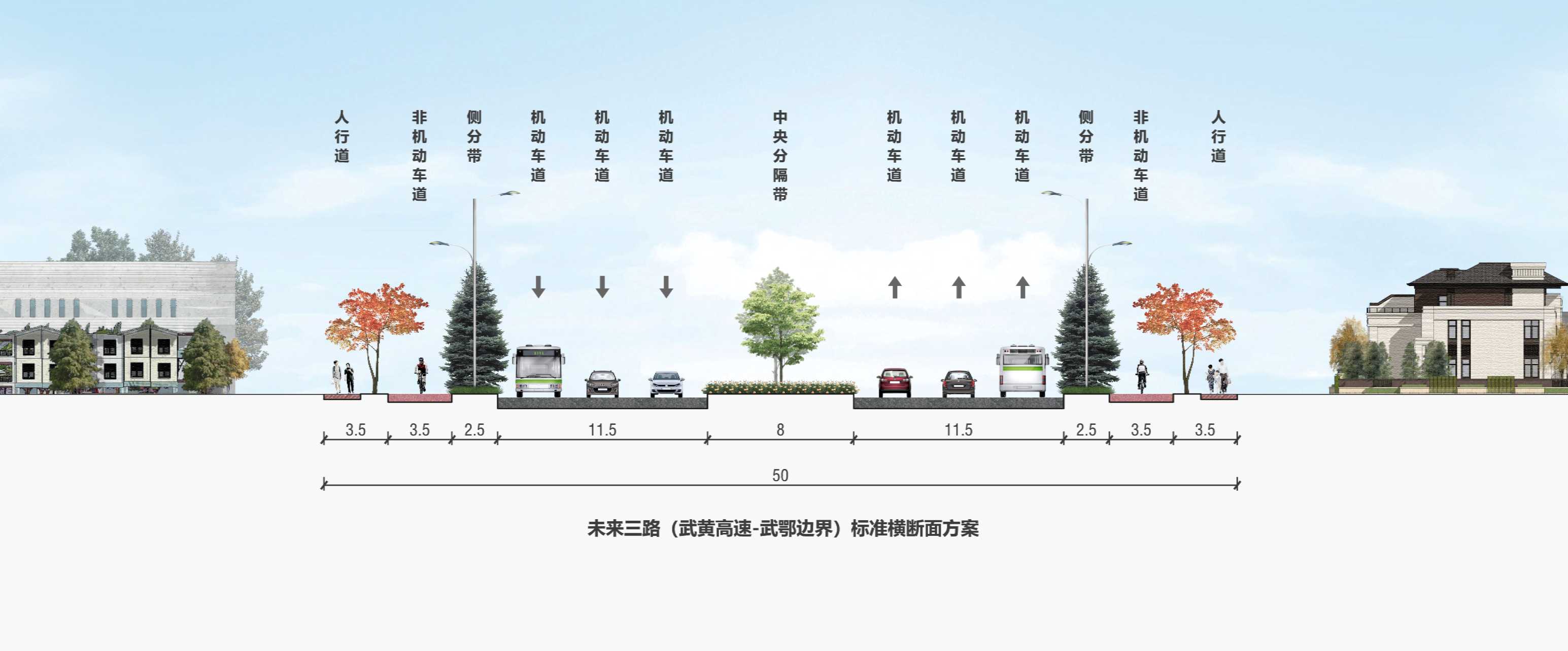 未來三路(武鄂邊界-武黃高速)位于鄂州市紅蓮湖大數據云計算產業園區北區,定位為紅蓮湖大數據云計算產業園的迎賓大道、景觀大道、形象大道、南北向交通樞紐。規劃為南北向城市主干路,北起于武鄂邊界,沿線依次與智慧一路、云端一路、云端二路、智慧二路平面相交,南止于智慧三路,全長1375.8m,設計速度60km/h,規劃紅線寬50m,雙向六車道。工程投資約9100.42萬元。