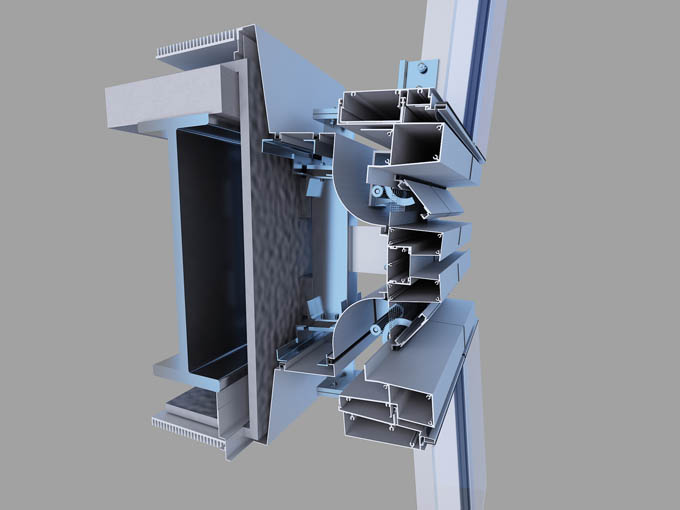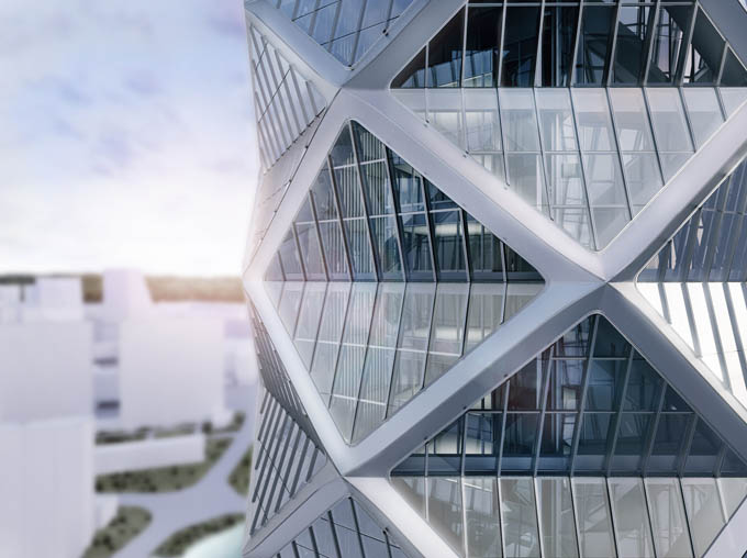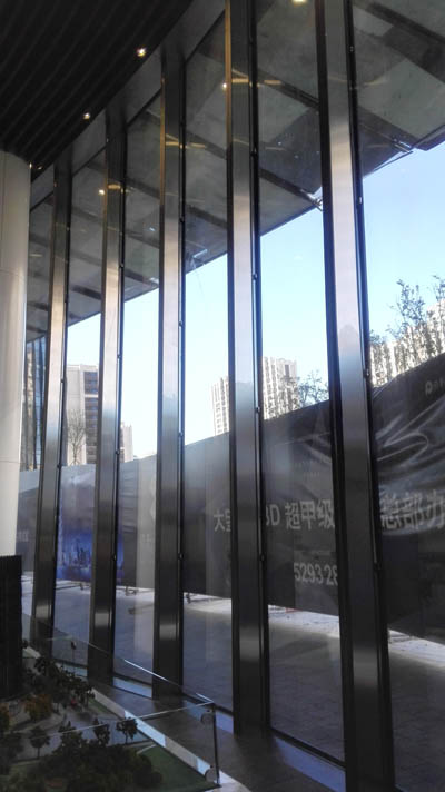 保利國際廣場塔樓1選用的是先進的雙層呼吸式幕墻,分內層幕墻、外層幕墻兩大部分。內層幕墻二層以上及我司均設計了多屏多腔高性能柔性可拆卸豎明橫隱框單元幕墻系統,首層大堂主要采用單向單拉索大跨度玻璃幕墻。外層幕墻由網格狀的鋁單板包柱分格成不同的菱形分塊,每個分塊又分成兩個三角形大板面。兩個三角形板面相交線為進出風口。網格內幕墻采用大跨度多屏多腔高性能柔性可拆卸豎明橫隱框單元幕墻系統??缍却笥?.2米板塊采用鋼鋁結合豎向公母型材。整個主樓立面運用了不同的折線鋁板包柱、三角形體塊搭配,突顯出建筑立面生動豐富、剛毅挺拔以及強烈的現代感。外層幕墻的面板主要采用鋁單板與高透玻璃,每二層設置進出風口。
